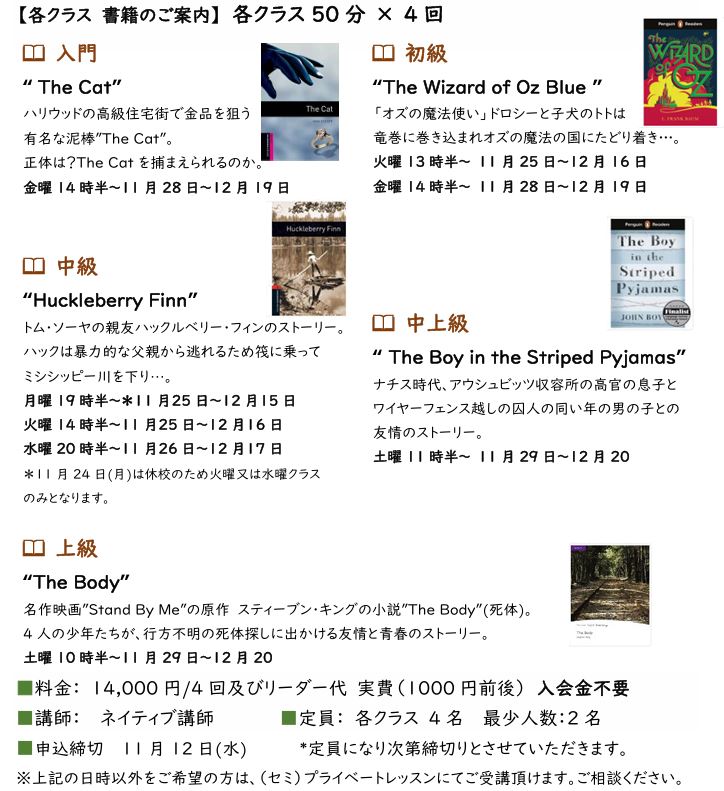 今年で11年目となる"Book Club"。特別講座として5月下旬〜開催します。一冊の*リーダーを英語で読む達成感、ストーリーを通して生きた英語表現に触れ、ストーリーについて英語で語り合う4回レッスンを実施します。